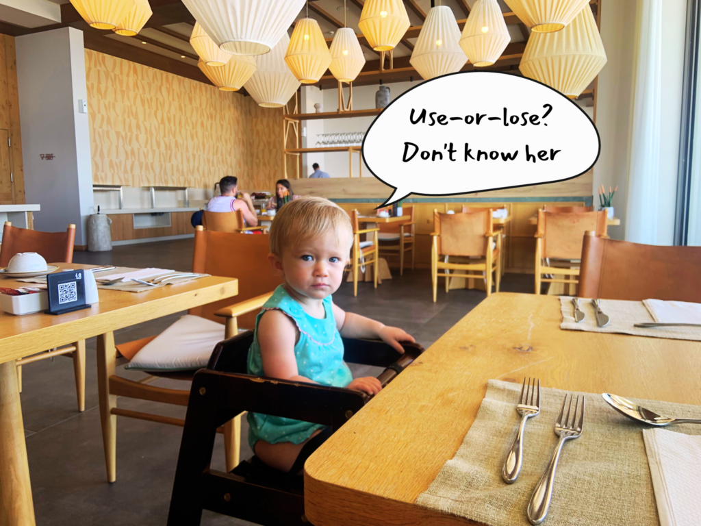 Our 1-year old, clearly excited for the buffet breakfast on our $3,000 Greek island vacation we paid for with pointsš