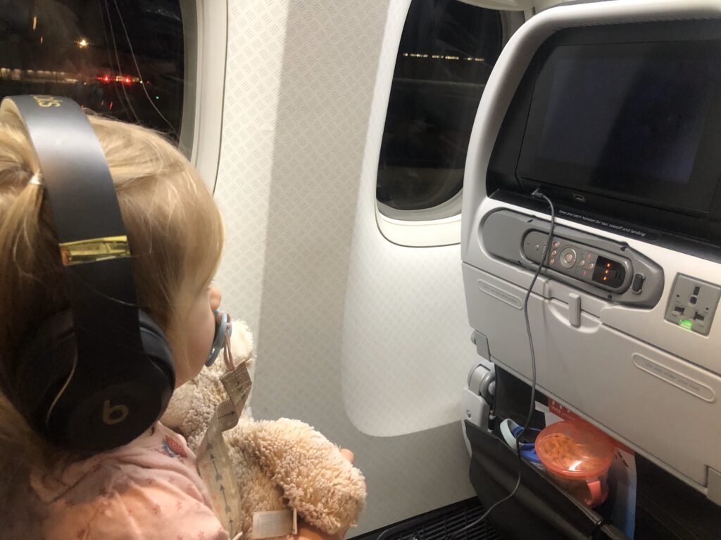Our daughter on her first flight back to the states since we PCS’d overseas, with her trusted travel companion, Monkey🐒